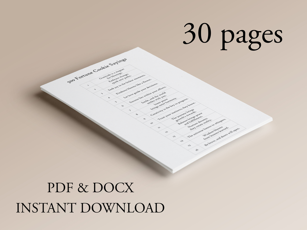 Instantly download these 500 Fortune Cookie Sayings! Find inspiration and positivity in our collection of motivational quotes, uplifting messages, and wise affirmations. Purchase now for immediate access to the digital (PDF & DOCX) files. Print, cut and enjoy the wisdom with each fortune cookie saying!